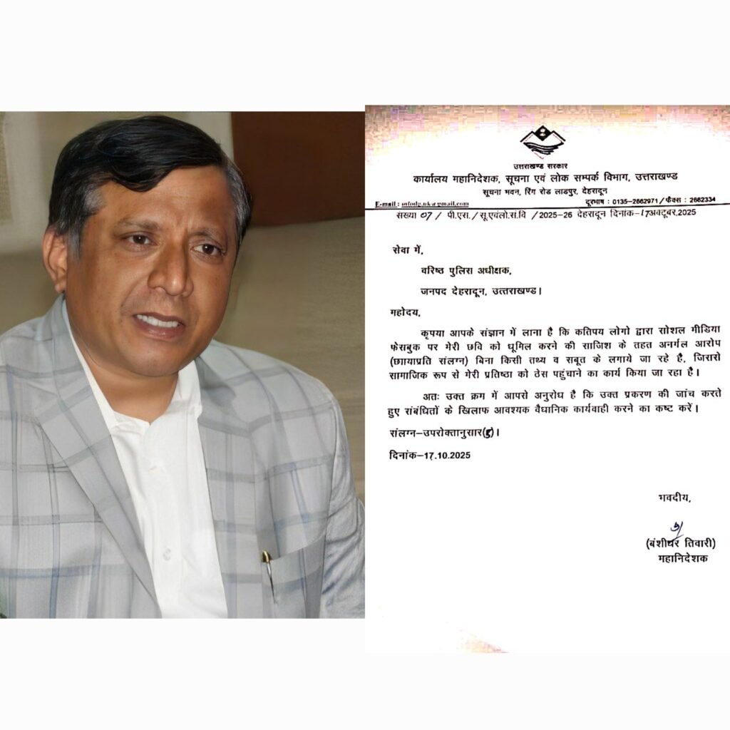 देहरादून, राज्य के सूचना महानिदेशक (DG Information) ने अब सोशल मीडिया पर उनके खिलाफ चल रहे भ्रामक और अनर्गल प्रचार को लेकर सख्त रुख अपनाया है। उन्होंने एसएसपी देहरादून को औपचारिक शिकायत दर्ज कराते हुए कहा है कि कुछ लोग सुनियोजित तरीके से उनकी छवि को धूमिल करने का प्रयास कर रहे हैं। शिकायत में उन्होंने इस साजिश के पुख्ता डिजिटल सबूत भी पुलिस को सौंपे हैं।